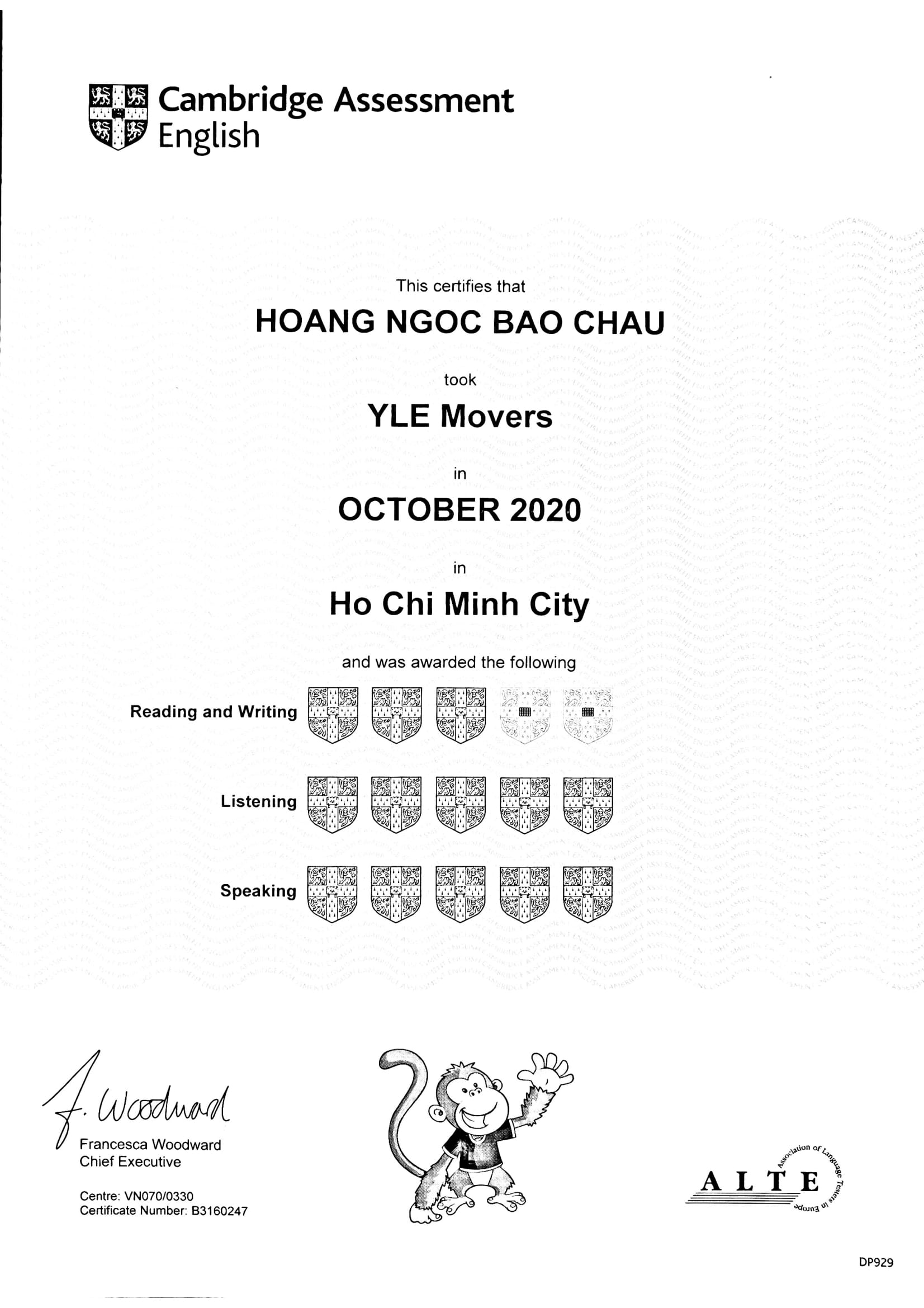 Hoàn thành cấp độ luyện thi Movers của chương trình Anh văn thiếu nhi tại Trung tâm ngoại ngữ Atlanta Language Educator, em Hoàng Ngọc Bảo Châu vừa nhận được kết quả Movers đạt 13 shields trong đợt thi tháng 10/2020 vừa qua do Hội Đồng Khảo Thí Tiếng Anh Đại Học Cambridge tổ chức thi và cấp bằng.