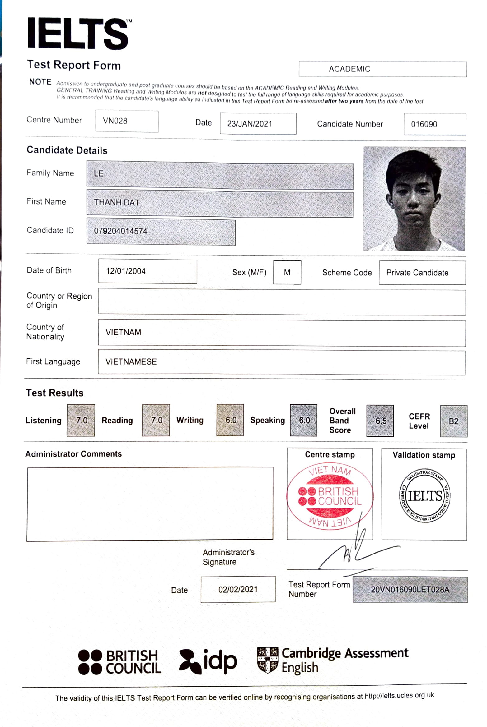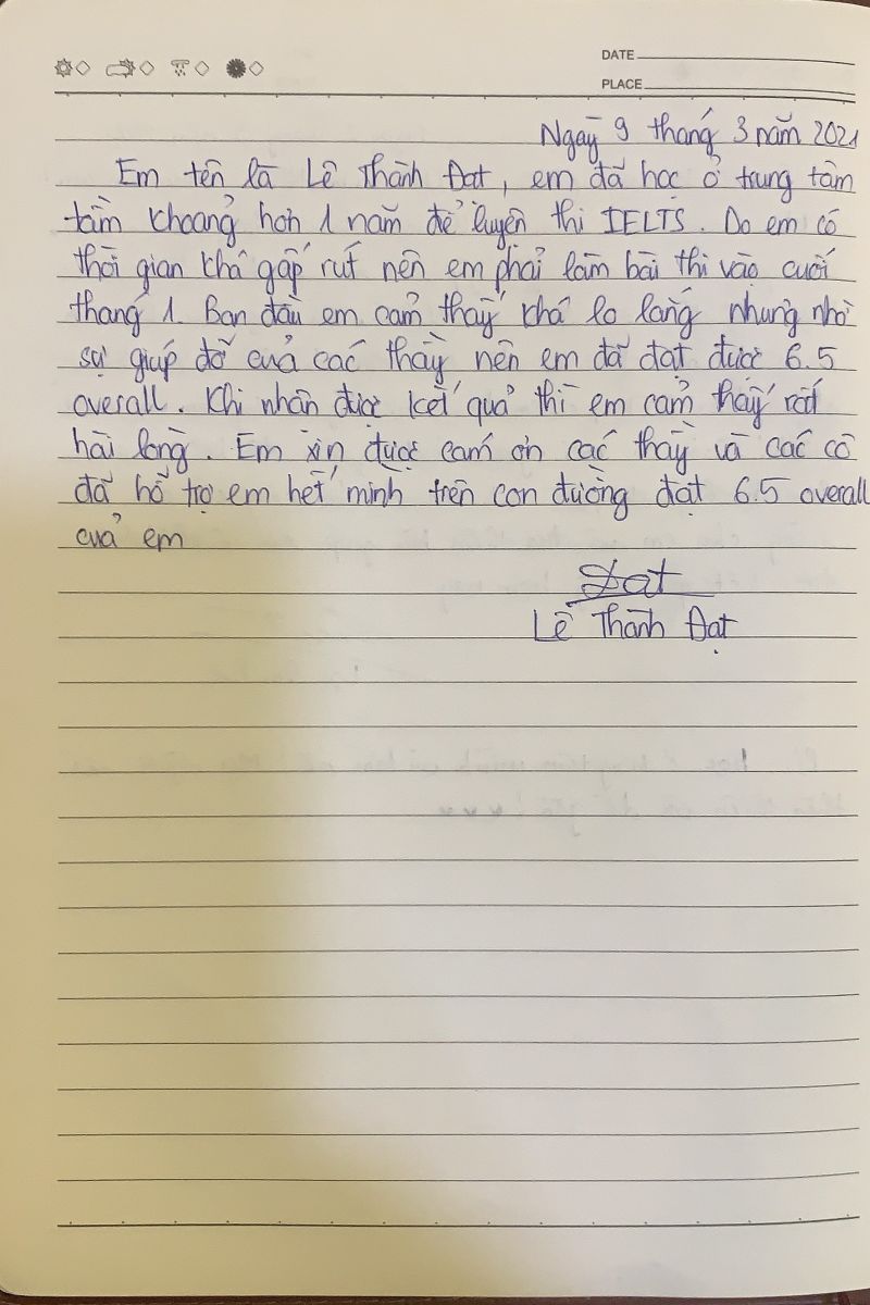 Trong 1 năm học tại trung tâm, với sự nỗ lực không ngừng của cả thầy và trò. Lê Thành Đạt đã đạt được IELTS 6.5, đúng với mục tiêu đặt ra ban đầu. Vui mừng với kết quả đạt được Thành Đạt đã đã gửi lời cảm ơn đến thầy cô đã hỗ trợ em về mọi mặt giúp em hoàn thành mục tiêu của mình. Đạt vui vẻ chia sẻ:" Em đã học ở trung tầm khoảng hơn 1 năm để luyện thi. Do em có thời gian khá gấp rút nên em phải làm bài thi vào cuối tháng 1. Ban đầu em cảm thấy khá lo lắng nhưng nhờ sự giúp đỡ của các thầy nên em đã đạt được 6.5 overall. Khi nhận được kết quả em cảm thấy rất hài lòng. Em xin được cảm ơn các thầy,cô đã hỗ trợ em hết mình trên con đường đạt overall 6.5 của em". Thành đạt cũng gửi lời cảm ơn đến tập thể nhân viên trong trung tâm đã hỗ trợ em rất nhiều để em có thể hoàn thành mục tiêu của mình.