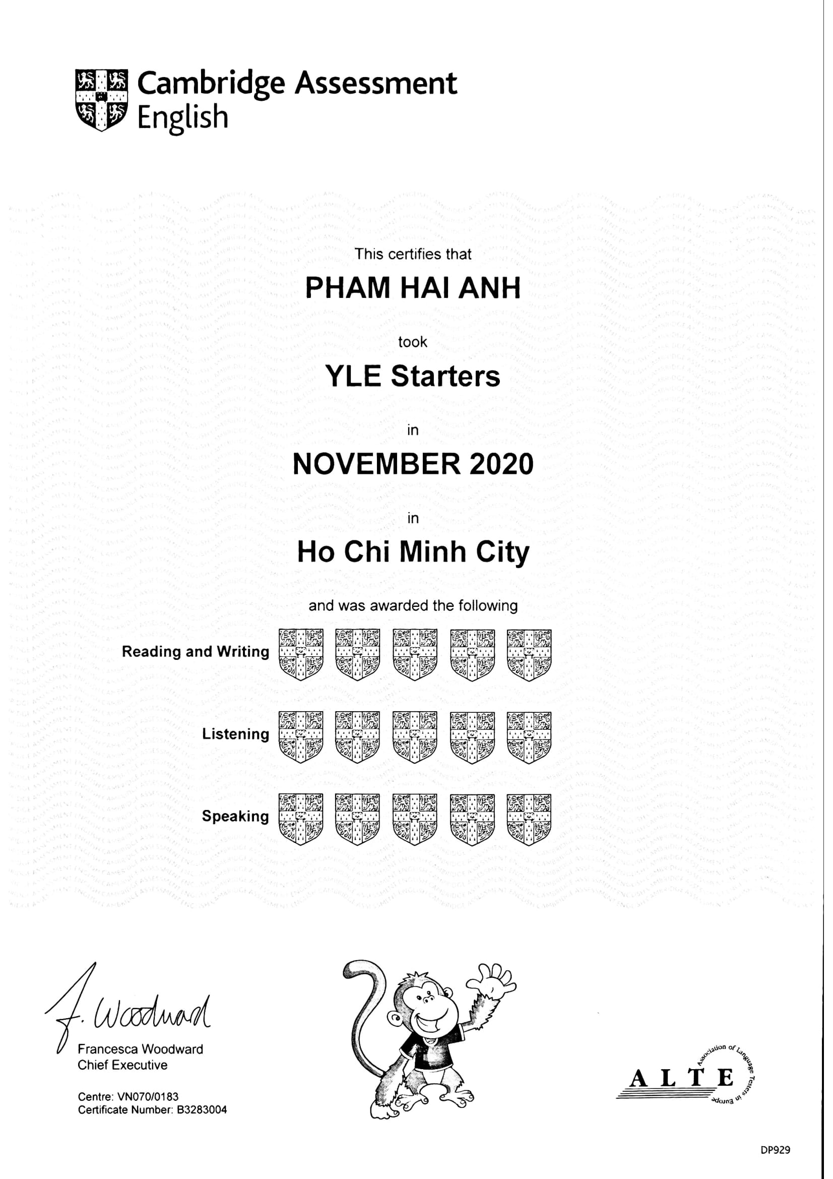Chúc mừng học viên Phạm Hải Anh đạt chứng chỉ quốc tế Starters 15 shields