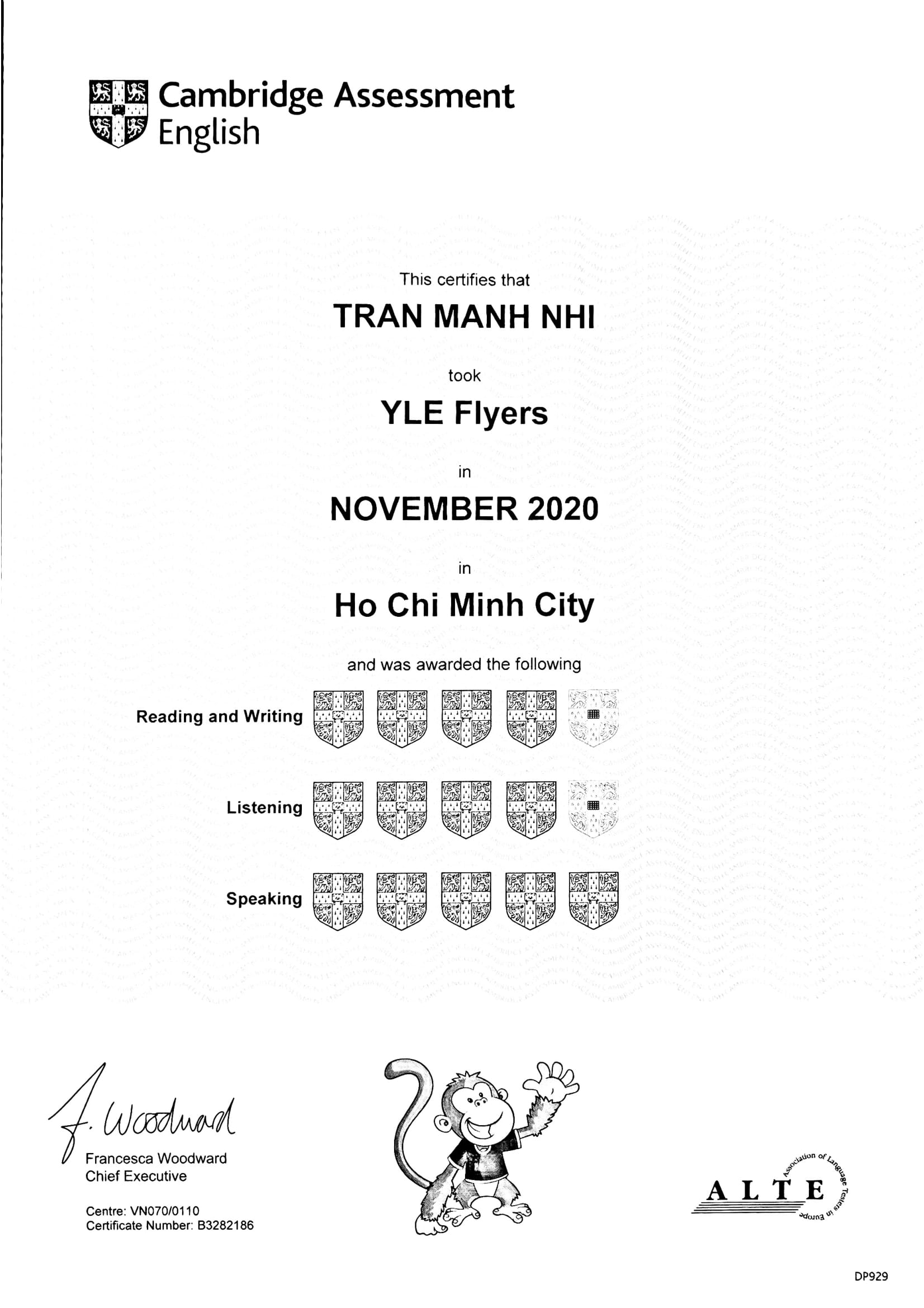 Hoàn thành cấp độ luyện thi Flyers của chương trình Anh văn thiếu nhi tại Trung tâm ngoại ngữ Atlanta Language Educator, em Trần Mạnh Nhi vừa nhận được kết quả Flyers đạt 13 shields trong đợt thi tháng 11/2020 vừa qua do do Hội Đồng Khảo Thí Tiếng Anh Đại Học Cambridge tổ chức thi và cấp bằng.