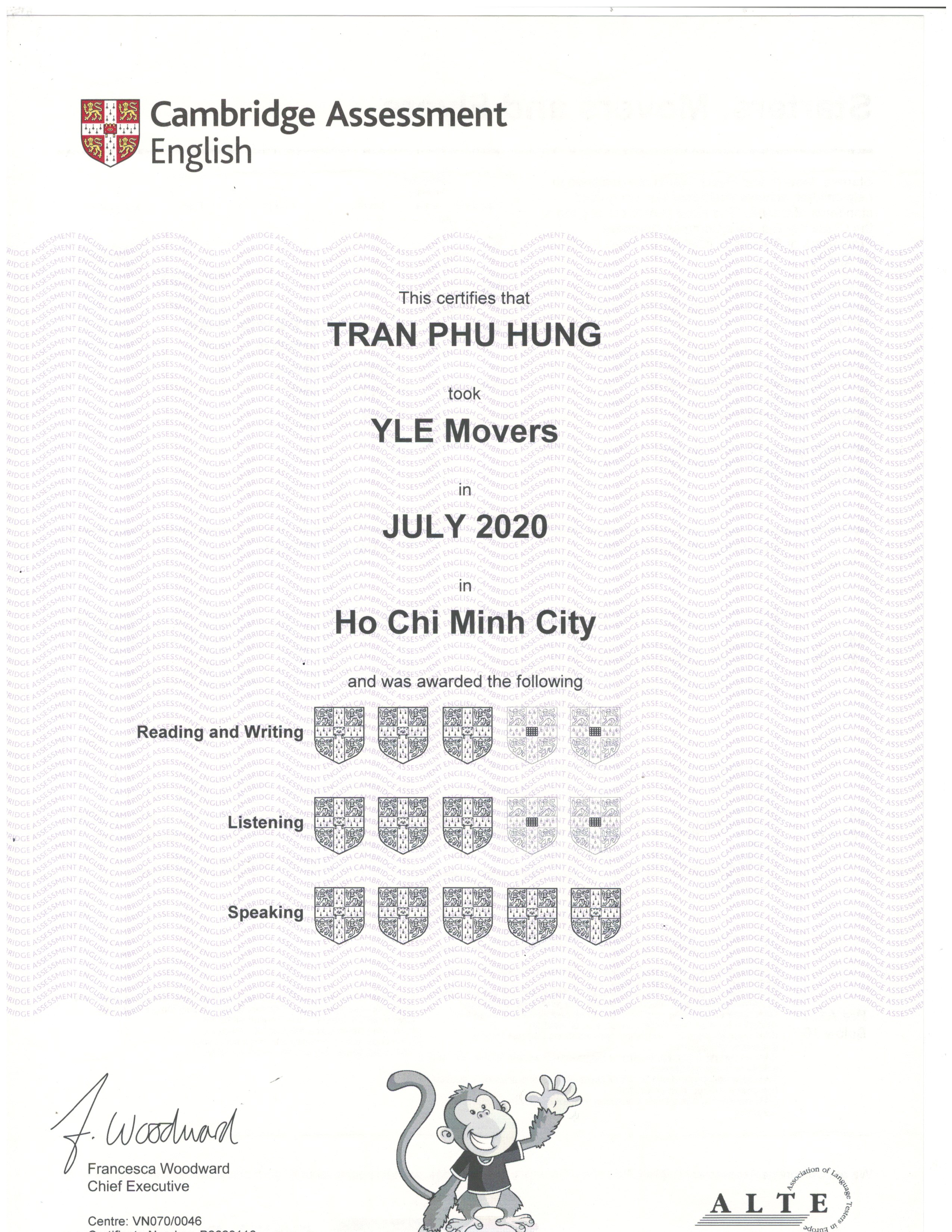 Hoàn thành cấp độ luyện thi Movers của chương trình Anh văn thiếu nhi tại Trung tâm ngoại ngữ Atlanta Language Educator, em Trần Phú Hưng vừa nhận được kết quả Movers trong đợt thi tháng 07/2020 vừa qua do do Hội Đồng Khảo Thí Tiếng Anh Đại Học Cambridge tổ chức thi và cấp bằng.