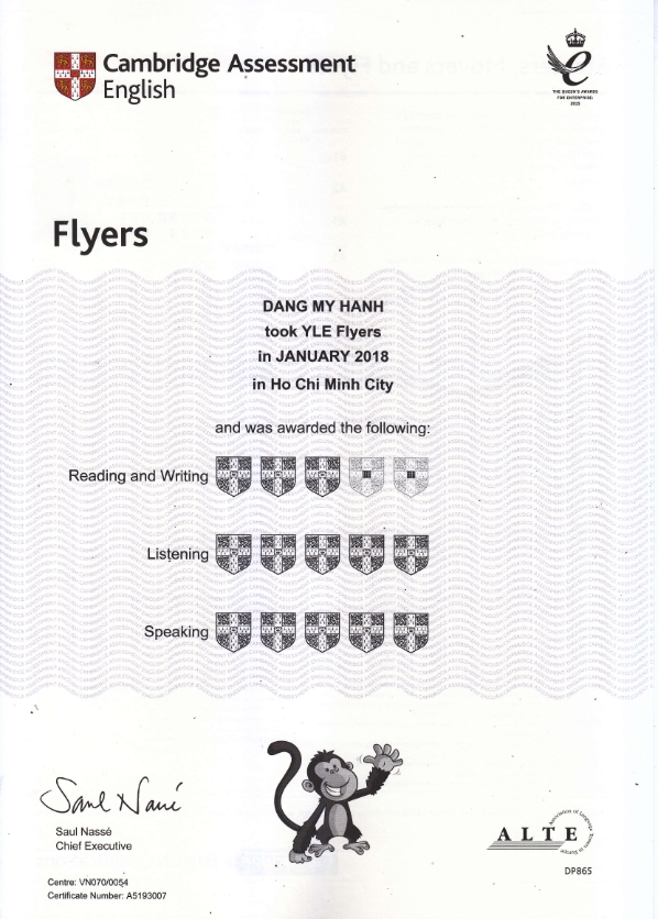 Hoàn thành cấp độ Flyers 4, em Đặng Mỹ Hạnh vừa nhận được kết quả Flyers đạt 13 shields trong đợt thi tháng 01/2018 vừa qua do Hội Đồng Khảo Thí Tiếng Anh Đại Học Cambridge tổ chức thi và cấp bằng.