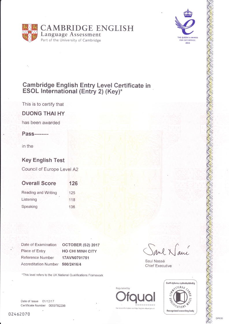 Hoàn thành cấp độ KET 4, em Dương Thái Hy vừa nhận được thi đạt chứng chỉ KET trong đợt thi tháng 12/2017 vừa qua do do Hội Đồng Khảo Thí Tiếng Anh Đại Học Cambridge tổ chức thi và cấp bằng.
