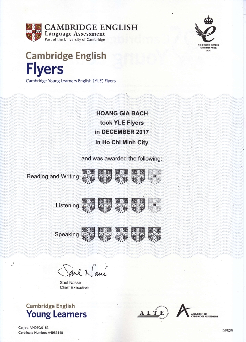 Hoàn thành cấp độ Flyers 4, em Hoàng Gia Bách vừa nhận được kết quả Flyers đạt 13 shields trong đợt thi tháng 12/2017 vừa qua do Hội Đồng Khảo Thí Tiếng Anh Đại Học Cambridge tổ chức thi và cấp bằng.