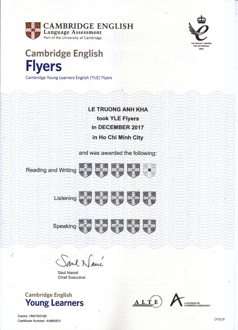 Hoàn thành cấp độ Flyers 4, em Lê Trương Anh Kha vừa nhận được kết quả Flyers đạt 14 shields trong đợt thi tháng 12/2017 vừa qua do Hội Đồng Khảo Thí Tiếng Anh Đại Học Cambridge tổ chức thi và cấp bằng.