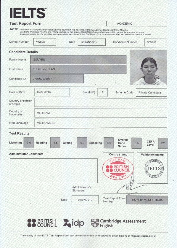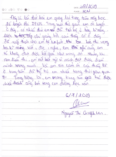 Chỉ vỏn vẹn 3 tháng, với sự nỗ lực không ngừng của cả trung tâm, thầy cô và bản thân Quỳnh Lan đã đạt IELTS 6.5 hoàn thành đúng với mục tiêu đặt ra . Hạnh phúc với kết quả đã đạt được, Quỳnh Lan đã gởi lời cảm ơn đến thầy, cô đã hỗ trợ cho em về mặt tinh thần giúp em hoàn thành mục tiêu của mình. Lan chia sẻ: “ Đây là lần thứ 2 em quay lại trung tâm này học để luyện thi ielts. Trong suốt thời gian em ôn luyện ở đây, có nhiều thứ em đã tiến bộ ở từng kĩ năng. Được chỉ dẫn bởi các thầy cô ở đây đã tiếp thêm cho em tự tin hơn. Lúc thi xong 3 kĩ năng viết, đọc, nghe ,em nghĩ rằng em sẽ không đạt được kết quả như mong đợi. Nhưng khi xem điểm thi em rất bất ngờ vì mình đạt được điểm mình mong muốn. Và em xin cảm ơn các thầy cô ở trung tâm đã hỗ trợ em nhiều trong thời gian qua. Trong tương lai em mong trung tâm sẽ gặt hái được nhiều thành công hơn trên con đường truyền đạt kiến thức ”.