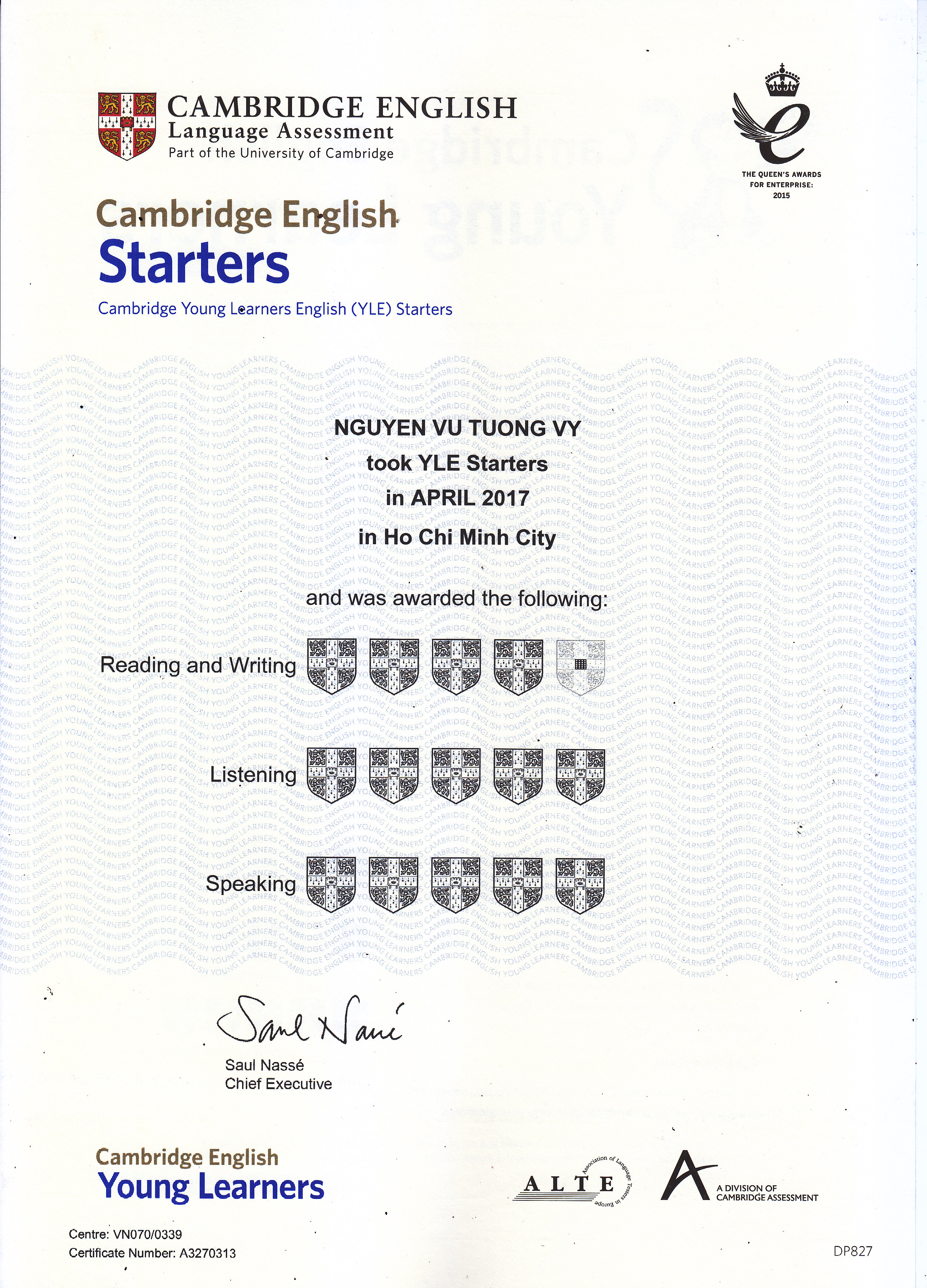 viên Nguyễn Vũ Tường Vy đã chinh phục chứng chỉ Quốc tế Starters do