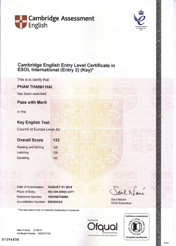 Tham gia khóa học luyện thi KET, học viên Phan Thanh Hải với những nỗ lực và phối hợp tốt với giáo viên đã thi được bằng KET với mức Merit sau 04 khóa học tại Trung tâm.