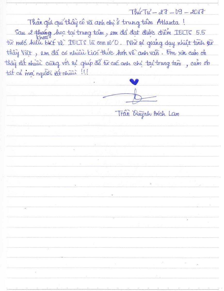Chúc mừng học viên Trần Quỳnh Bích Lam đạt được IELTS 5.5 chỉ sau 2 khóa học IELTS (Public) tại Trung tâm ngoại ngữ Atlanta Language Educator.