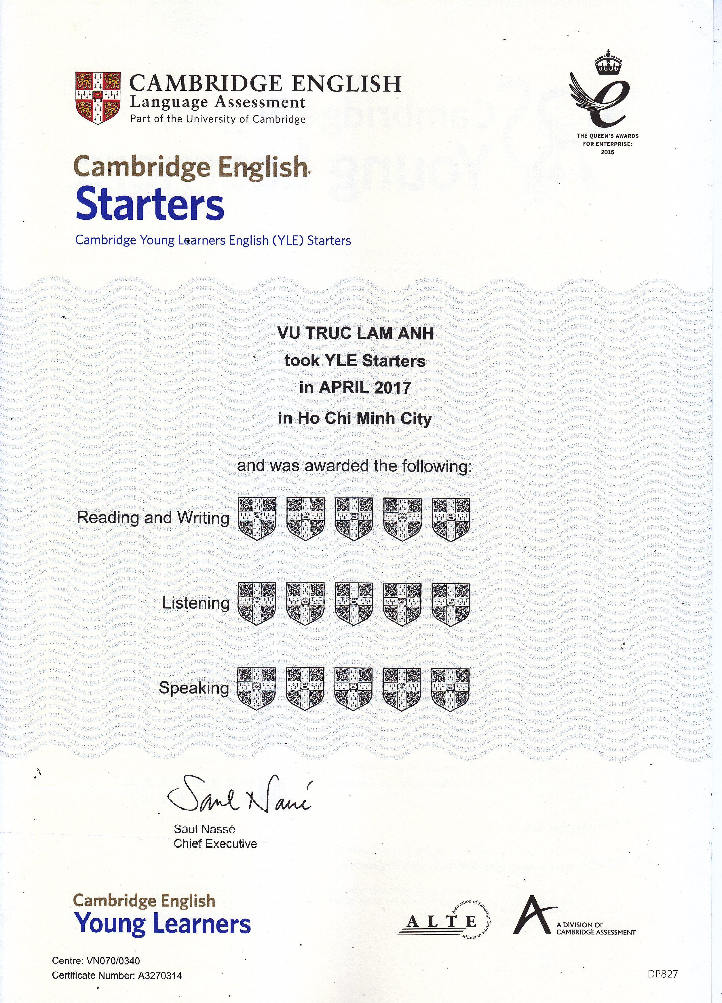 viên Vũ Trúc Lam Anh đã chinh phục chứng chỉ Quốc tế Starters do